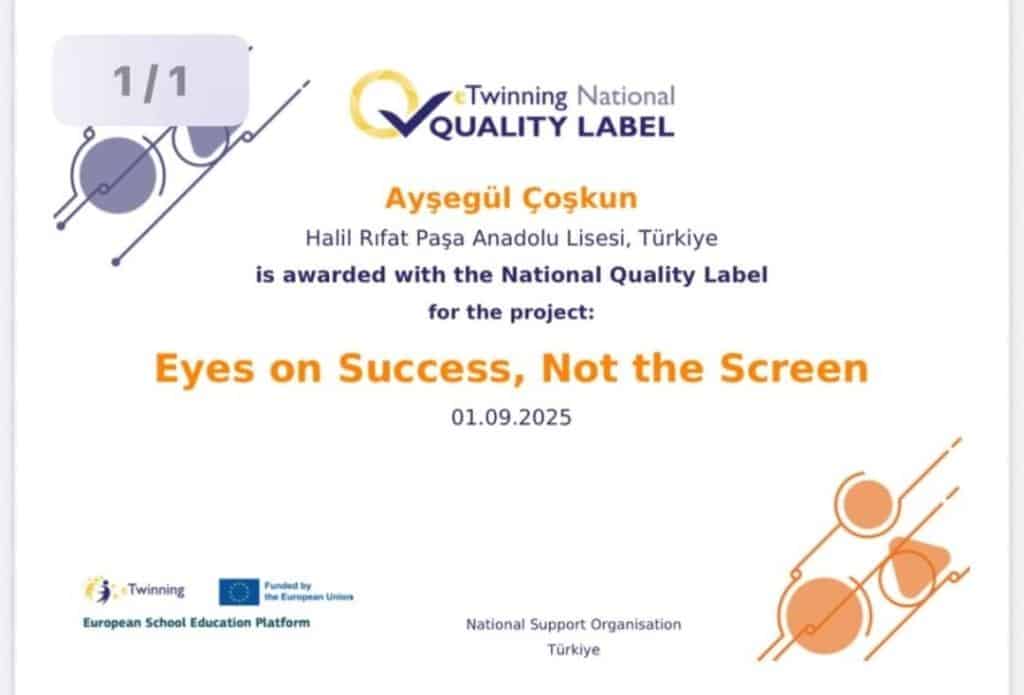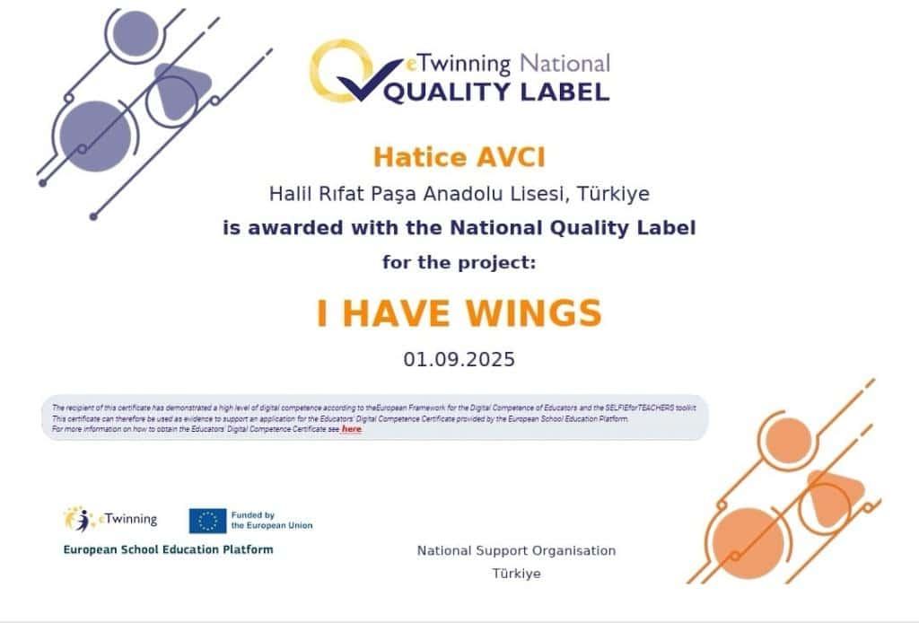 2024-2025 eğitim-öğretim yılında okulumuz e-Twinning Kulübü, Ayşegül Coşkun ve Hatice Avcı rehberliğinde “Eyes on Success, Not the Screen” ve “I HAVE WINGS” projelerini yürütmüş, Eylül 2025’te bu çalışmalarla toplam 3 Ulusal Kalite Etiketi kazanmıştır.